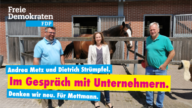 Vom Stadtrat in die Betriebe - welche Möglichkeiten und Ressourcen sehen Unternehmer aus Mettmann in ihrer Stadt und was wünschen sie sich von der Politik der kommenden Jahre? Für uns, die FDP Mettmann, ist ein Dialog über die Realitäten und Gestaltungsmöglichkeiten der Stadt mit Unternehmern der Schlüssel zu einer erfolgreichen Politik in der kommenden Amtsperiode. Unternehmen sind der Motor für Wachstum und Wohlstand in Mettmann, denn sie bringen Gewerbesteuereinnahmen in die Stadtkasse, von denen alle Bürger in Mettmann profitieren, und schaffen Arbeitsplätze. Unsere Bürgermeisterinnenkandidatin Andrea Metz und Stadtratskandidat Dietrich Strümpfel, selbst Unternehmer in Obschwarzbach, suchen den Dialog mit Mettmanns Unternehmern und machen sich zu einer Besuchsrunde durch Mettmanns Betriebe auf.